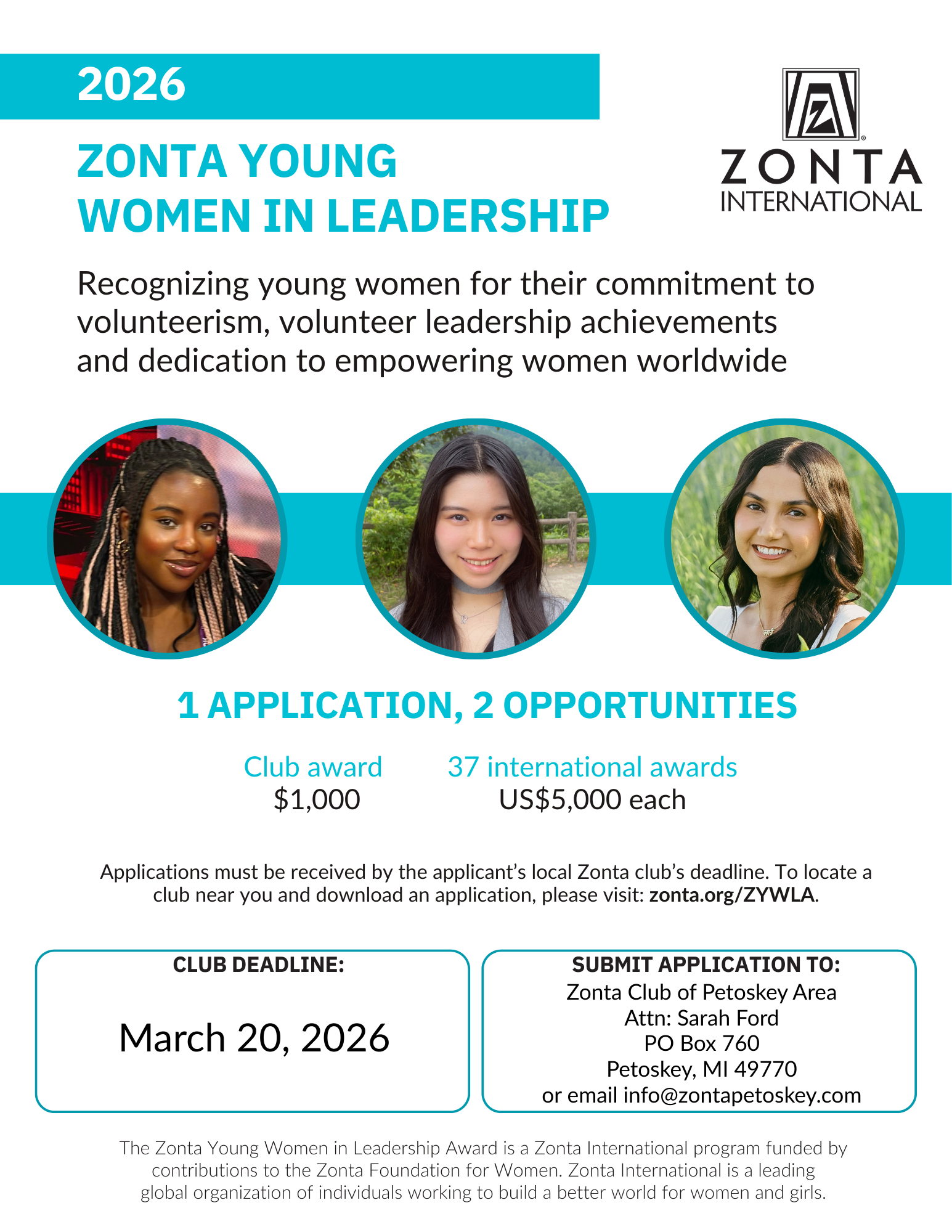 (Petoskey, MI, February 11, 2026) Applications for the 2026 Zonta Young Women in Leadership Award are now available from the Zonta Club of Petoskey Area. One applicant from Emmet County will receive $1,000 award from the Zonta Club of Petoskey and then be recommended for a district/region award. One recipient per district receives a district/region award and their application is considered for an International Award.